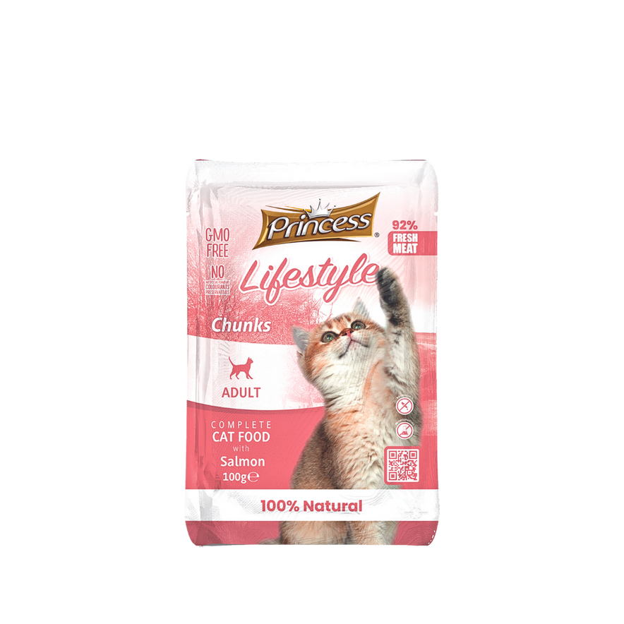 Princess Lifestyle Salmon Chunks for cats is a complete wet food formulated for adult cats, made with Salmon chunks in gravy or jelly. It is a GMO-free product that provides high-quality protein and does not contain artificial colors or preservatives. 92% fresh meat. 100% natural. For adult cats. 100g. Made in Malta.