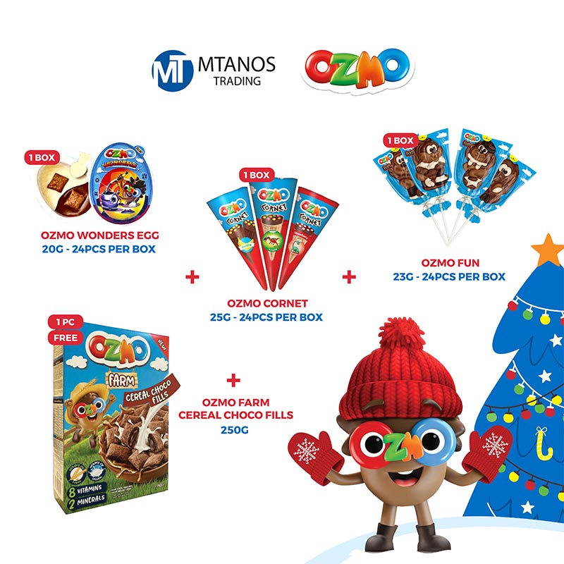1 box Ozmo Cornet (25g x 24pcs per box) + 1 box Ozmo Wonders Egg (20g x 24pcs per box) + 1 box Ozmo Fun (23g x 24pcs per box) + 1 Pc Ozmo Farm Cereal Choco Fills 250g FREE