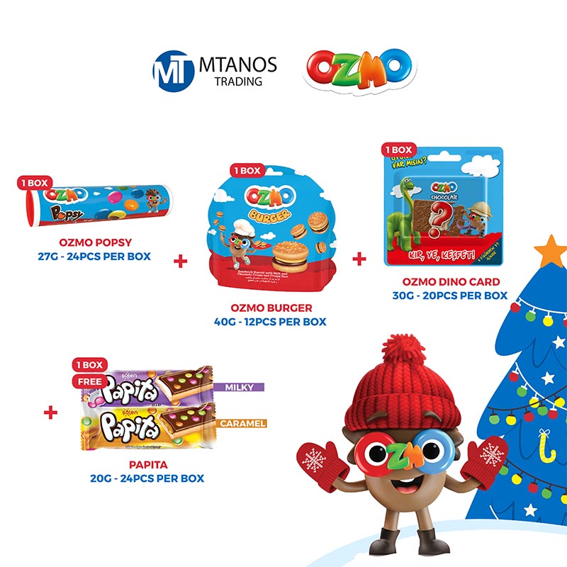 1 box Ozmo Dino Card (30g x 20pcs per box) + 1 box Ozmo Burger (40g x 12pcs per box) + 1 box Ozmo Popsy (27g x 24pcs per box) + 1 box Papita Milky or Caramel (20g x 24pcs per box) FREE