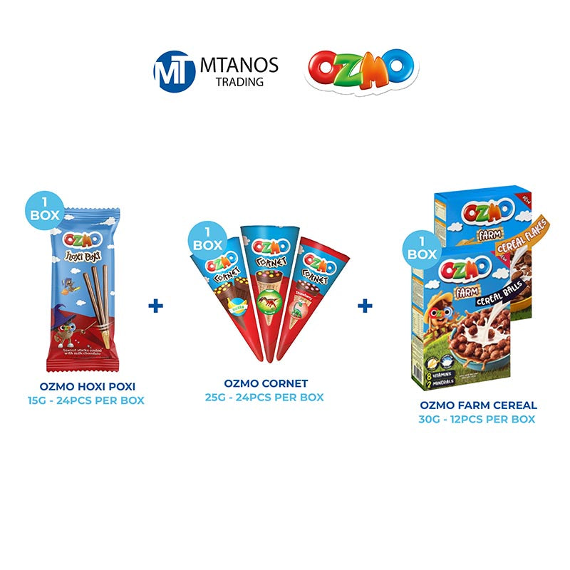 1 box Ozmo Hoxi Poxi (15g x 12pcs per box) + 1 box Ozmo Cornet (25g x 24pcs per box) + 1 box Ozmo Farm Cereal Balls or Flakes (30g x 12 pcs per box)