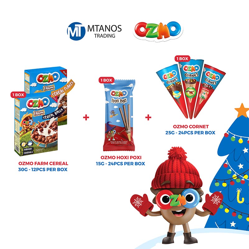 1 box Ozmo Hoxi Poxi (15g x 12pcs per box) + 1 box Ozmo Cornet (25g x 24pcs per box) + 1 box Ozmo Farm Cereal Balls or Flakes (30g x 12 pcs per box)