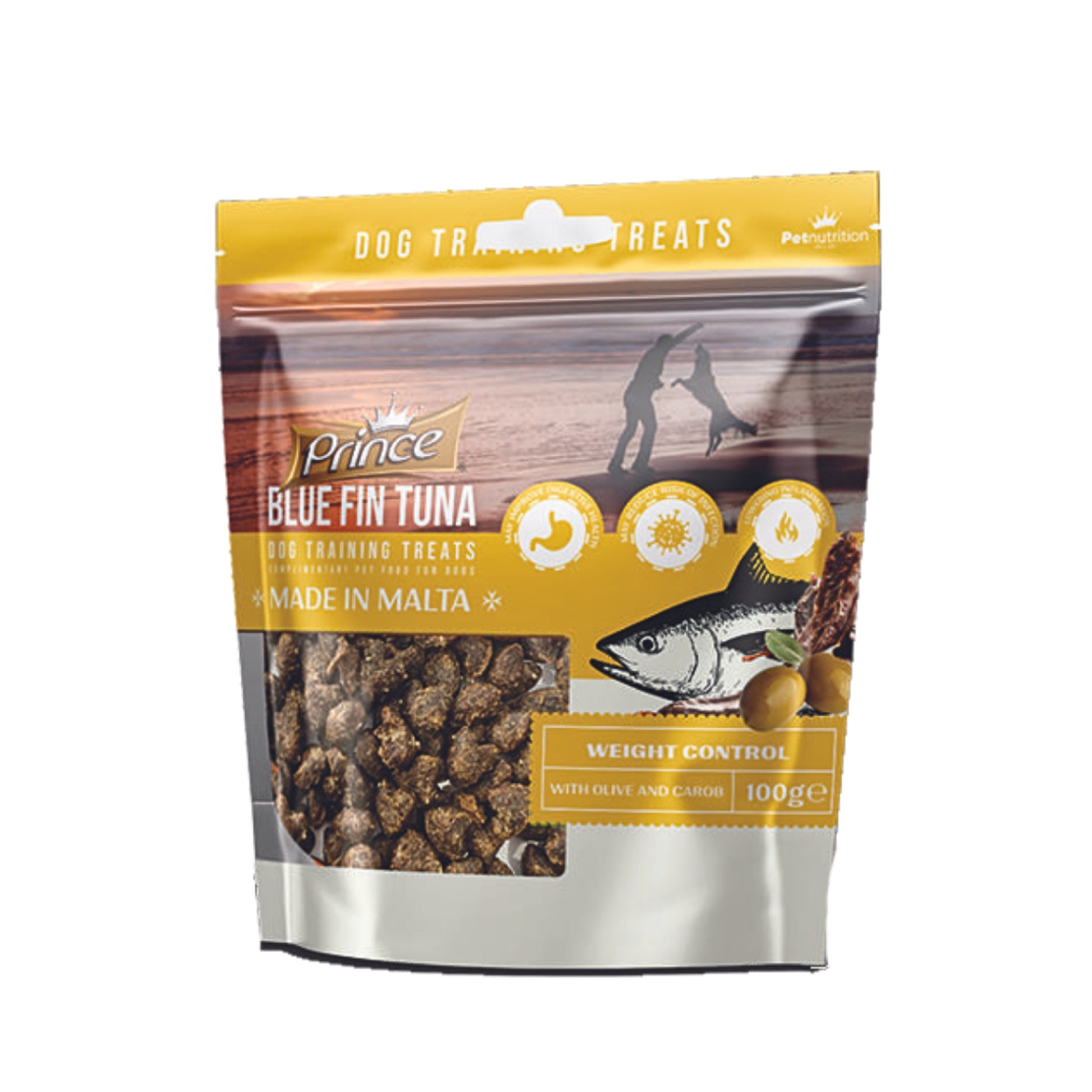 Prince Blue Fin Tuna Dog Training Treats. Complimentary Pet Food For Dogs. Improves Digestive Health. May Reduce Risk of Infection. Lowering Inflammation. With Olive and Carob. 100g. Made in Malta.