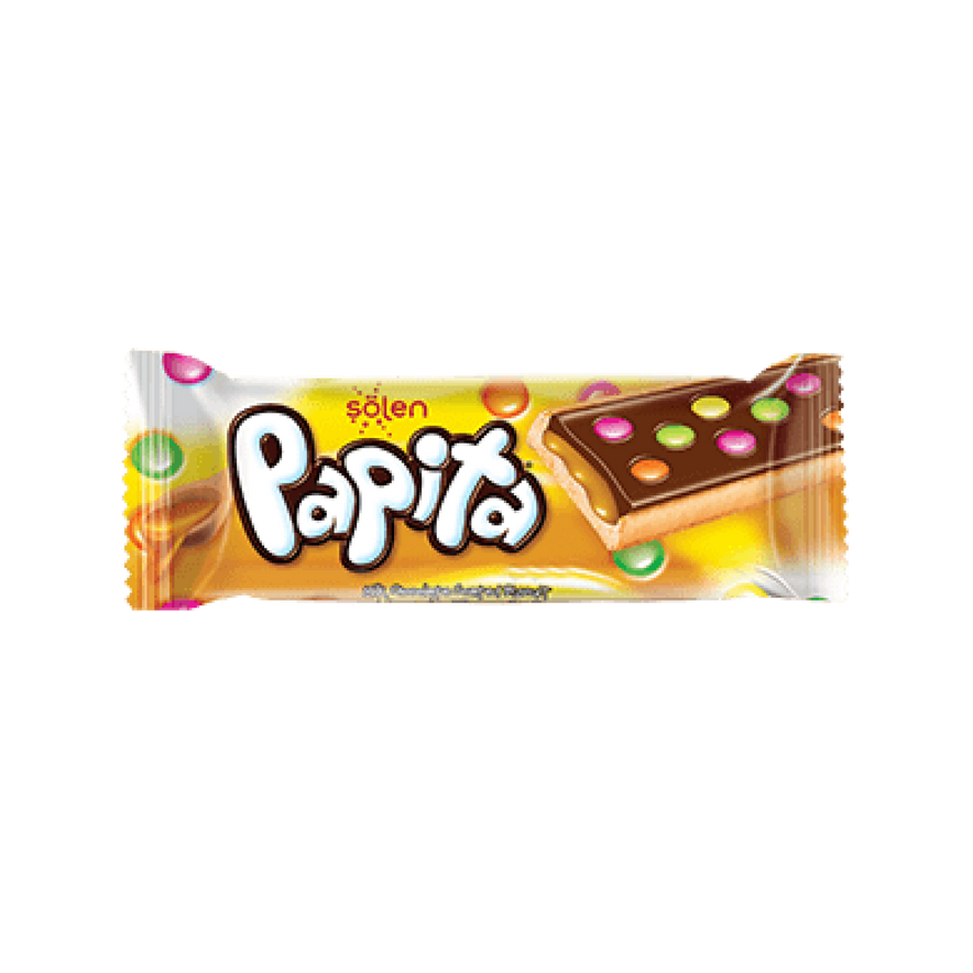 Solen Papita Milk Chocolate & Caramel Biscuits This Papita Biscuit is the perfect mix of chocolate, biscuit and caramel topped with dragged candies. Made in Turkey